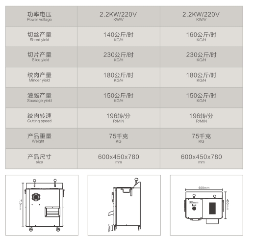 全不锈钢强力绞切两用机,可绞肉、灌肠、切肉片、肉丝等,100%铜芯电机,加厚不锈钢外壳,绞切组件均由不锈钢装配,外观简洁大方,操作简便安全,工作效率高,质量过硬、性价比高