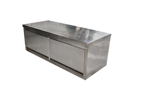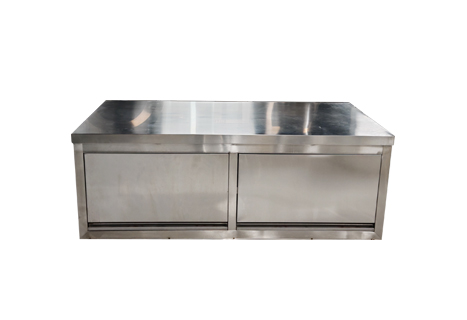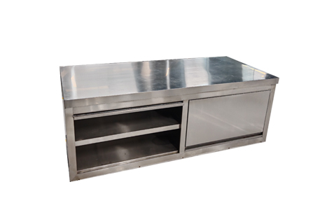 秋千门双通工作台面板采用201不锈钢加厚型,带加强筋加固,柜门为上翻式秋千门,坚固耐用,中间才隔层板,储存空间打,适用于各类商用厨房。