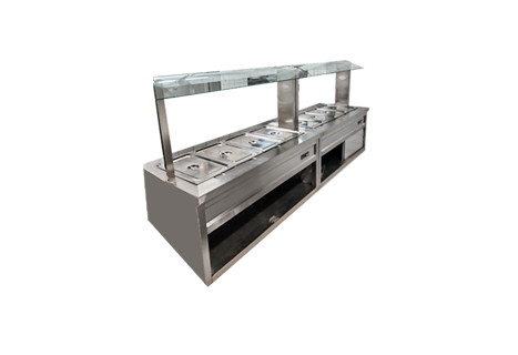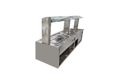 柜式带玻璃罩保温售卖台采用优质不锈钢台面和份数盆,大功率加热管,不锈钢重力脚,容量大,加热快,能够快速保温,适用于大类商用厨房。